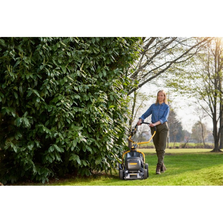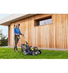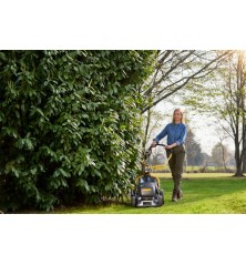 A COMBI 748e V egy gyors, robusztus és erőteljes akkumulátoros fűnyíró, amely biztosítja a stresszmentes, vezetéknélküli fűnyírást. Tartós galvanizált acél pengével rendelkezik. A különösen nagy teljesítményű, 1,5 kW-os szénkefe nélküli motor hatékony és kényelmes fűnyírást biztosít. A COMBI 748e V egyszerűen használható, hat sebességfokozat és egy takarékos mód közül választhat. Az elülső megerősített rész védelmet biztosít az esetleges ütközések ellen, és a fogantyú segítségével könnyebben emelhető a gép. Az akkumulátor és töltő nem tartozék. Ajánlott munkaterület 550 m² Akkumulátorfeszültség 48V Akkumulátorkapacitás 2x4Ah Erőforrás Lítium-ion akkumulátor Gyűjtő kapacitása 60 l Kerék Golyóscsapágyazott 200 mm / 2800 mm Markolat Összecsukható Meghajtás Önjáró Munkamagasság 22-80 mm Munkaszélesség 46 cm Súly 29 kg Tartozékok Akkumulátor és töltő nem tartozék. Teljesítmény 1500 W Termék csomagolási hosszúsága 925 mm Termék csomagolási magassága 490 mm Termék csomagolási szélessége 575 mm Termék csomagolási súlya 34,2 kg Vágás módja Gyűjtés, mulcsozás, oldalsó kiszórás, hátsó kiszórás Vágásmagasság száma 6 pozíció Vágásmagasság állítás Központi, manuális Váz Galvanizált acél