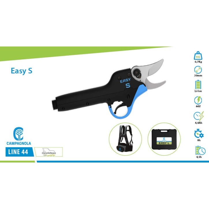 Erős és gyors, az Easy S elektromos metszőolló a LINE 44 termékcsoport része. A 30 mm-es vágási átmérőjével minden szőlőskertbe és gyümölcsösökbe, bármilyen fás szárú növény metszésére ajánljuk. Az akkumulátornak köszönhetően egy egész munkanapos kapacitással rendelkezik és az a teljes LINE 44 csoport termékeivel kompatibilis.