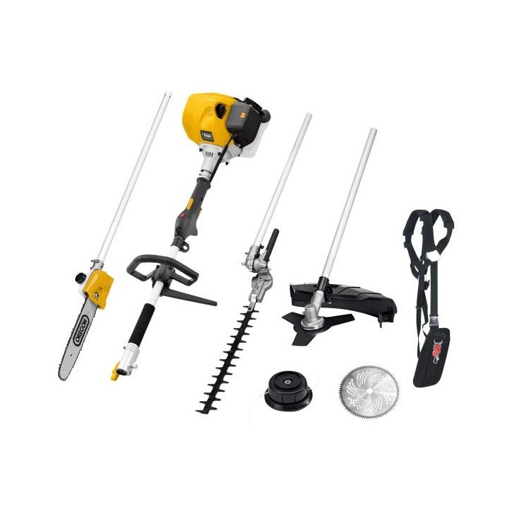 Motor 2-ütemű nettó teljesítmény 1,25 kW Hengerűrtartalom 52 cm3 Munkaszélesség 43 cm-es damil / 25 cm-es kés / 25 cm-es láncfűrész / 41 cm-es sövénynyíró Vágófej Tap’n go Penge 3 fog + 80 fog Hám Tömeg 6,9 kg (kiegészítő felszerelés nélkül)