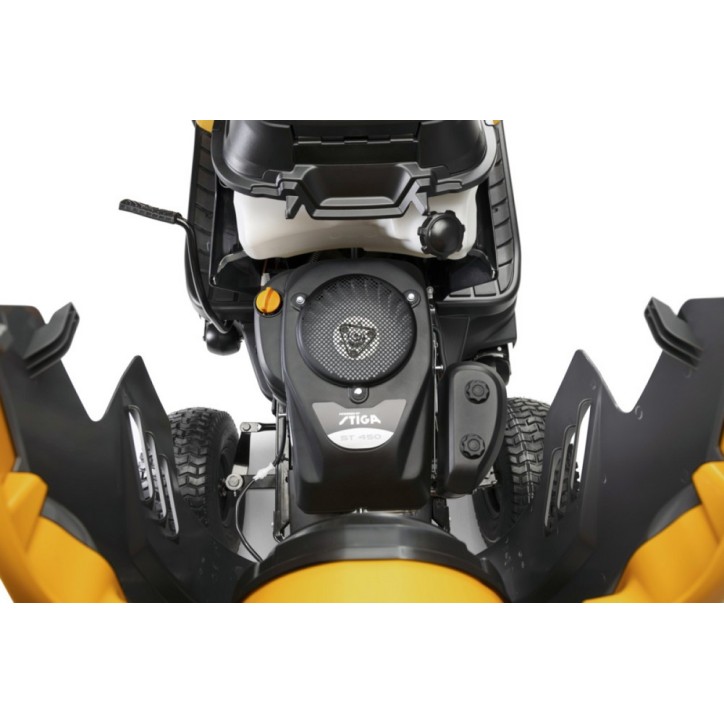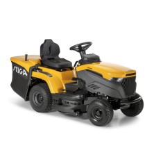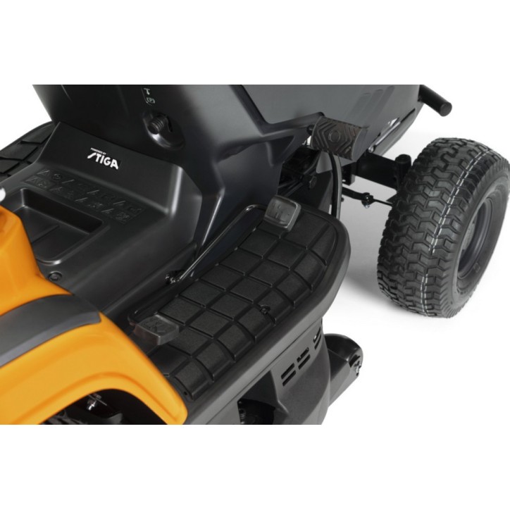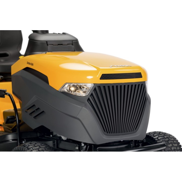 A STIGA ESTATE 384 közepes méretű kertekhez ajánlott. Hajtása: 6.8 kW-os STIGA motor, hidrosztatikus hajtással. A 84 cm-es kétkéses vágóasztal 7 vágási magasságban állítható 25 és 80 mm között. Ön dönti el, hogy a füvet gyűjti a 240 l hátsó fűgyűjtőbe, vagy mulcsozza a mulcsozó dugó behelyezésével. Az ESTATE 384 traktort puha markolatú STIGA new comfort kormánykerékkel és első fényszórókkal látták el. A vezető kényelmét a STIGA new comfort ülés biztosítja. Az akkumulátortöltő opcionális, a vonószem és a mulcsozó a készlet tartozéka. Kétoldali mosó csatlakozóval rendelkezik a késasztal. A traktor hátrameneti vágás funkcióval, vezetőkerekekkel a vágóasztalon és lökhárítóval van szerelve.