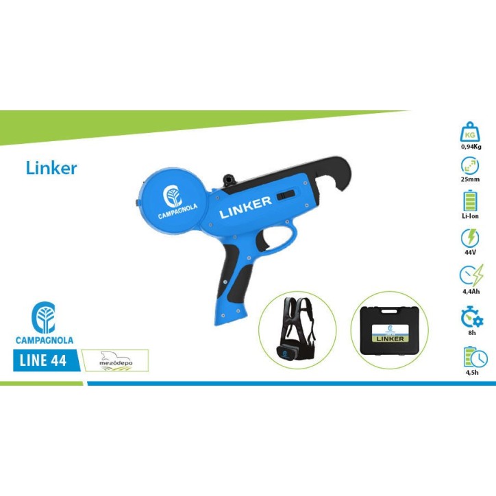 A Campagnola Linker LINE 44 akkus kötöző készlet professzionális kötözőgép szőlőültetvények, gyümölcsösök és kertészeti kultúrák gyors és hatékony kötözési munkáihoz. A Campagnola által fejlesztett automata kötözőgép jelentősen felgyorsítja a munkavégzést, akár 50%-kal csökkentve a kézi kötözéshez szükséges időt és fizikai terhelést. A LINKER kötözőgép percenként akár 60 kötést képes elvégezni, miközben az ergonomikus kialakítás és a kis súly hosszabb munkavégzés során is kényelmes használatot biztosít. A nagy kapacitású 44V Li-Ion akkumulátor akár egy teljes munkanapon keresztül biztosít energiát, így ideális választás szőlőültetvények, gyümölcsfák, bogyós kultúrák és egyéb kertészeti növények rögzítéséhez. A Campagnola Line 44 rendszer részeként az akkumulátor több professzionális eszközzel is kompatibilis.