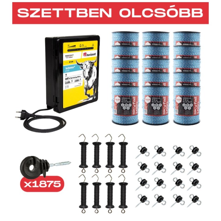 ALAP villanypásztor alkatrész összeállítás nagytestű haszonállatok kordában tartására. A gazdasági állatok számára kialakított csomag tartalmaz egy TURBOMAX N1430 típusú 25 Joule teljesítményű 230V-os villanypásztor készüléket, továbbá 15000 m villanypásztorvezetéket, facsavaros szigetelõket, kapufogókat és kapuszigetelõket. Az alap csomag a rendszer, egymással kompatibilis főbb elemeit tartalmazza. Amennyiben teljeskörű alkatrészkészletre van szüksége egy új karám kialakításához, válasszon a TELJES szett csomagajánlataink közül. A paraméter listában tételesen megtalálja a csomagban található alkatrészek listáját. Paraméterek