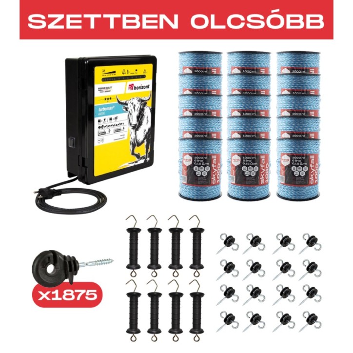 ALAP villanypásztor alkatrész csomag nagyvadak (medve, gímszarvas, vaddisznó, farkas) távol tartására. A vadkár megelőzésére összeállított készlet tartalmaz egy TURBOMAX AN800 típusú, 12 Joule teljesítményű 12V-os DUO üzemű villanypásztor készüléket, továbbá 15000 m villanypásztorvezetéket. A DUO készülékek üzemeltethetőek 12V-os munkaakkumulátorról is (a csomag akkumulátort nem tartalmaz) valamint kiegészíthető napelemmel modullal is a folyamatos sziget üzem biztosítása érdekében. A csomag tartalmazza a 12/230V-os hálózati adaptert! Az alap csomag a rendszer, egymással kompatibilis főbb elemeit tartalmazza. Amennyiben teljeskörű alkatrészkészletre van szüksége egy új karám kialakításához, válasszon a TELJES szett csomagajánlataink közül. A paraméter listában tételesen megtalálja a csomagban található alkatrészek listáját.