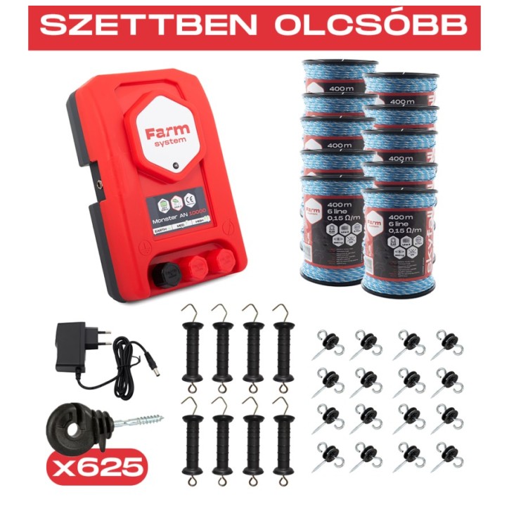ALAP villanypásztor alkatrész csomag nagyvadak (medve, gímszarvas, vaddisznó, farkas) távol tartására. A vadkár megelőzésére összeállított készlet tartalmaz egy FARMSYSTEM MONSTER AN1000 típusú, 10 Joule teljesítményű 230V-os hálózatról is üzemeltethető villanypásztor készüléket, továbbá 4000 m villanypásztorvezetéket, facsavaros szalagszigetelõket, kapufogókat és kapuszigetelõket. Az alap csomag a rendszer, egymással kompatibilis főbb elemeit tartalmazza. Amennyiben teljeskörű alkatrészkészletre van szüksége egy új karám kialakításához, válasszon a TELJES szett csomagajánlataink közül. A paraméter listában tételesen megtalálja a csomagban található alkatrészek listáját.