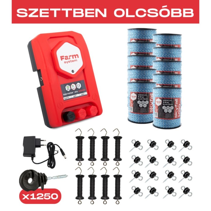 ALAP villanypásztor alkatrész csomag nagyvadak (medve, gímszarvas, vaddisznó, farkas) távol tartására. A vadkár megelőzéséére összeállított készlet tartalmaz egy FARMSYSTEM MONSTER AN1000 típusú, 10 Joule teljesítményű 12V-os DUO üzemű villanypásztor készüléket, továbbá 10000 m villanypásztorvezetéket. A DUO készülékek üzemeltethetõek 12V-os munkaakkumulátorról is (a csomag akkumulátort nem tartalmaz) valamint kiegészíthető napelemmel modullal is a folyamtos sziget üzem biztosítása érdekében. A csomag tartalmazza a 12/230V-os hálózati adaptert! Az alap csomag a rendszer, egymással kompatibilis főbb elemeit tartalmazza. Amennyiben teljeskörű alkatrészkészletre van szüksége egy új karám kialakításához, válasszon a TELJES szett csomagajánlataink közül. A paraméter listában tételesen megtalálja a csomagban található alkatrészek listáját.