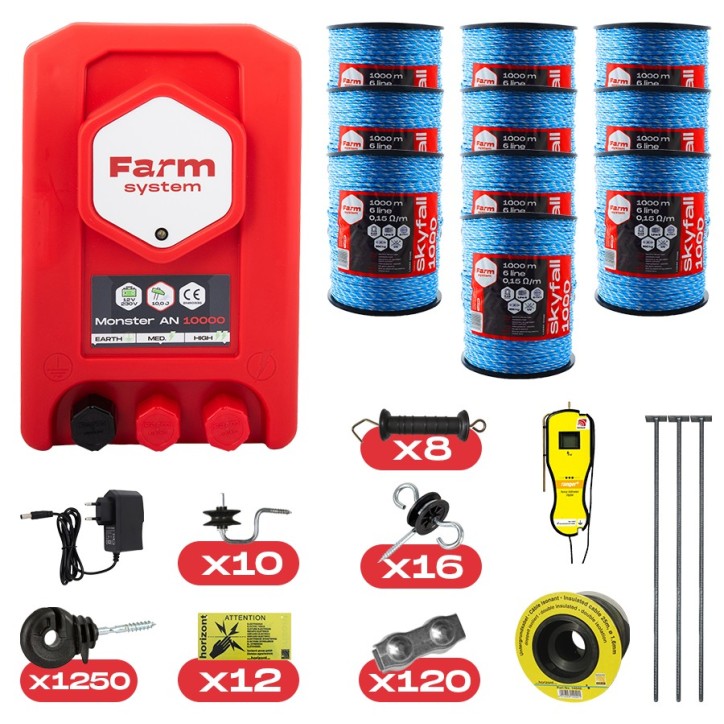 ELJES villanypásztor alkatrész összeállítás nagyvadak (medve, gímszarvas, vaddisznó, farkas) távol tartására. A vadkár megelőzésére összeállított készlet tartalmaz egy FARMSYSTEM MONSTER AN1000 típusú, 10 Joule teljesítményű 12V-os DUO üzemű villanypásztor készüléket, továbbá 10000 m villanypásztorvezetéket, facsavaros szigetelőket, kapufogókat és kapuszigetelõket, sarokszigetelõket, csatlakozókat, földelés alkatrészeit, táblát, villanypásztor tesztert. A DUO készülékek üzemeltethetőek 12V-os munkaakkumulátorról is ( a csomag akkumulátort nem tartalmaz) valamint kiegészíthető napelemmel modullal is a folyamatos sziget üzem biztosítása érdekében. A csomag tartalmazza a 12/230V-os hálózati adaptert! A TELJES szett minden szükséges alkatrészt tartalmaz, kizárólag az oszlopokról kell Önnek gondoskodnia. A paraméter listában tételesem megtalálja a csomagban található alkatrészek listáját.